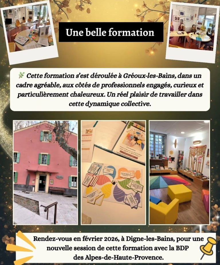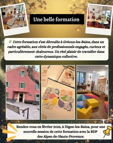 En décembre 2025, j’ai animé une formation professionnelle autour du club lecture jeunesse, à Gréoux-les-Bains, pour la BDP des Alpes-de-Haute-Provence.