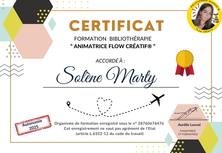 Je m’engage dès lors dans des actions de prévention et d’accompagnement. Dans cette continuité, je découvre la bibliothérapie jeunesse créative et je commence à me former en 2023 avec Aurélie Louvel et multiplie les formations « Contes et Merveilles » et « Flow Créatif ». Je complète mon parcours auprès de Marine Nina Denis en 2024.